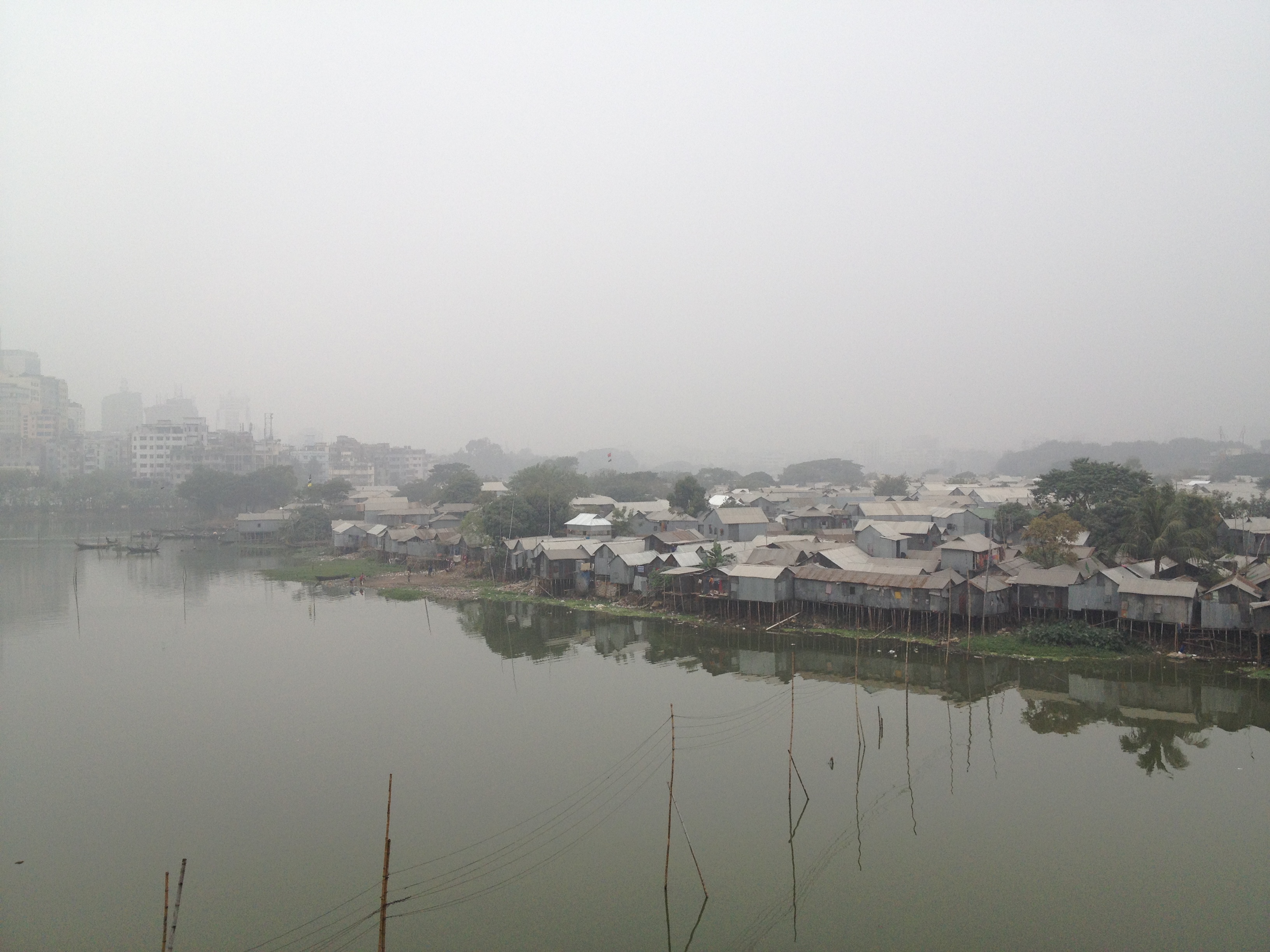 In bed with the curtain open – Watching the night develop over the slums next door. The mist draws in. Poor air quality gives the lights a lovely, hazy quality.