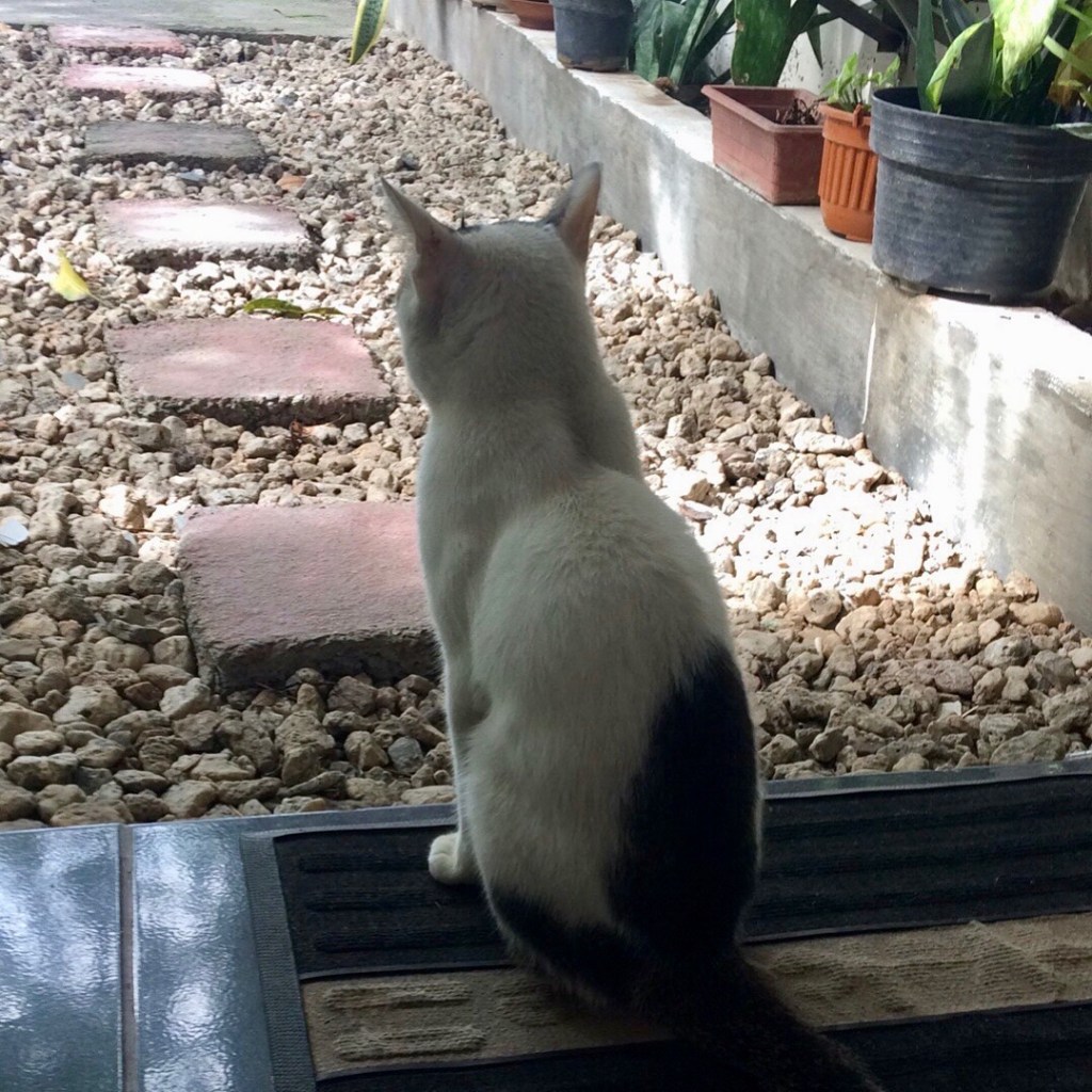 The second day in my flat I’m cooking garlic, and in walks a cat. Mister Busa has stayed. I’m happy for the company, and he is happy with the dog food I feed him – cat food is hard to come by. I try not to make any sudden movements, and I like to think that he tries not to attack me – but he always does. He can be a bit scary sometimes, but he likes my company, and I’m happy he is around.